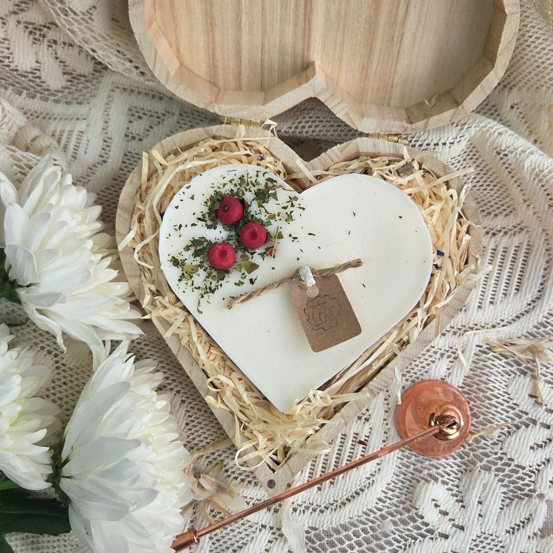 Large handmade heart candle, beautifully decorated with red berry wax melts and presented in a rustic wooden heart-shaped gift box.