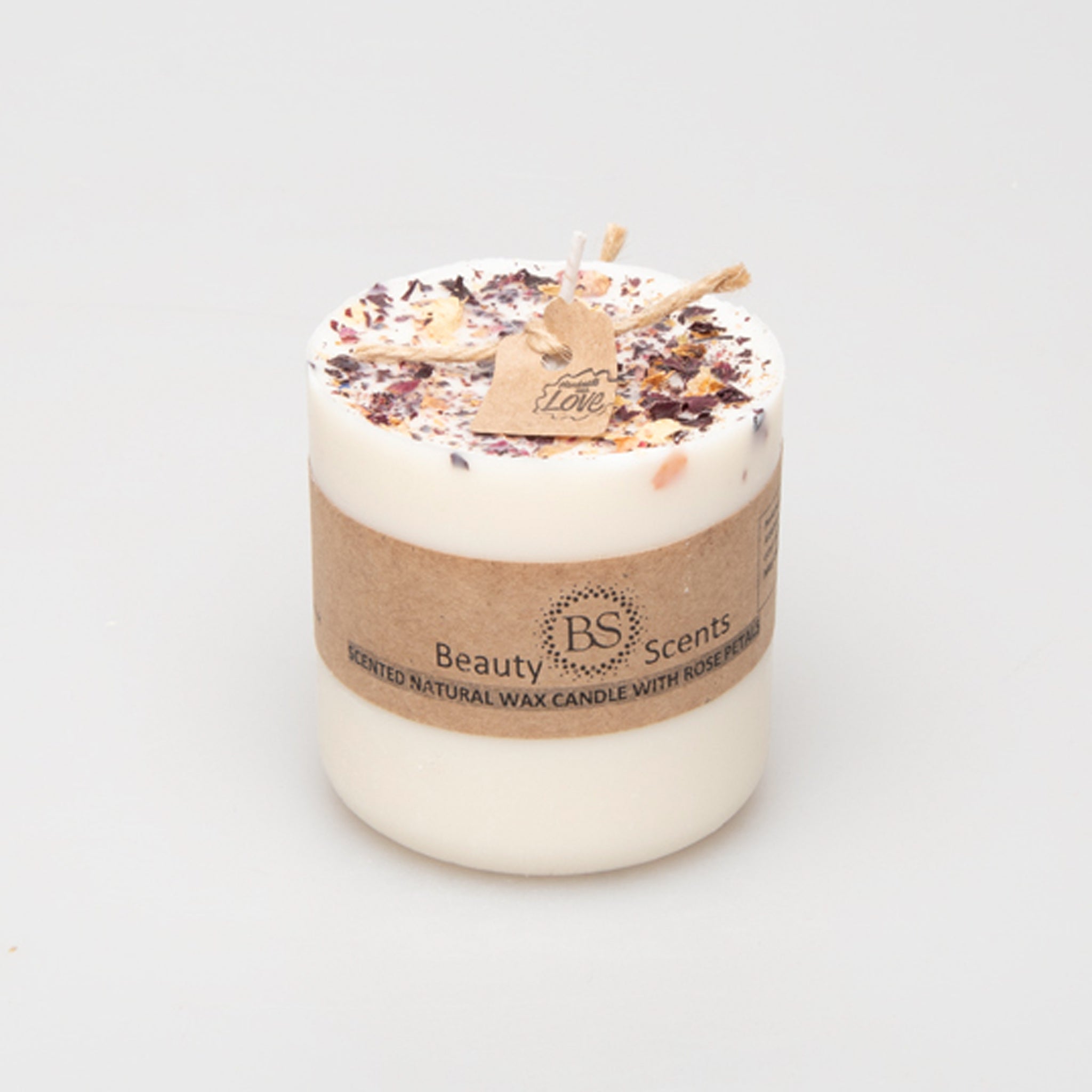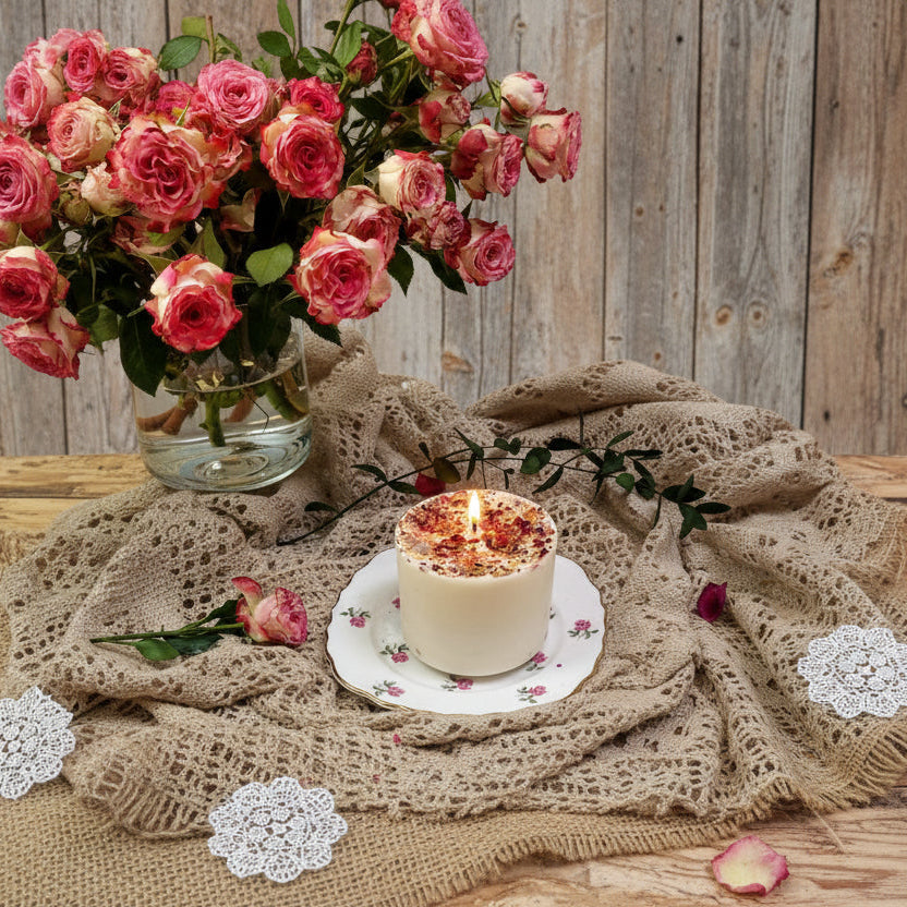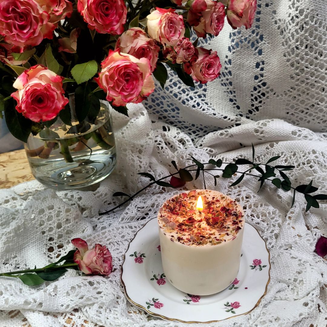 Handmade candle was made of soy wax, Fragrance Oil, rose petals.