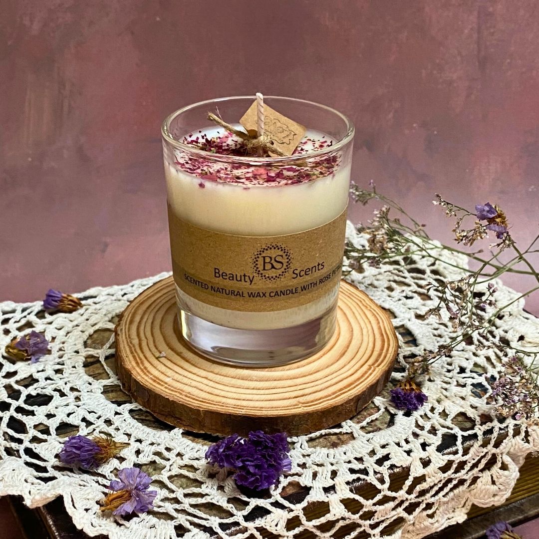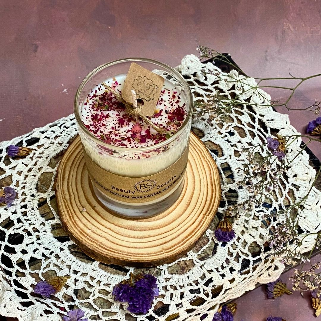 Handmade candle was made of soy wax, Fragrance Oil, rose petals.